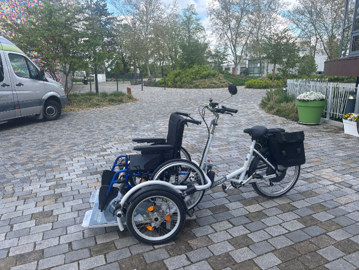 Tous les résidents n’ont pas la possibilité de profiter de cette opportunité ; c’est pourquoi l’idée a été de rechercher et d’investir dans un triporteur équipé d’une plateforme, permettant ainsi de sortir les résidents en fauteuil roulant sans avoir à effectuer de transfert. Ce triporteur sera utilisé lors des promenades hebdomadaires ainsi que pendant le séjour Elsass Pédal’âge 2.
